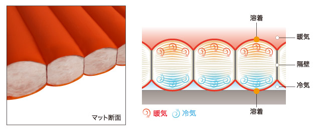 ■中綿入りボックス構造・・・チューブ間に隔壁を設けたボックス構造に、優れた耐久性を備え、濡れても保温性をキープする独自素材「エクセロフト」を封入。隔壁が高く設定されているので、コールドスポットができにくく優れた保温性を発揮。さらに、中綿「エクセロフト」がチューブ内の空気の対流を抑え、断熱性を高めています。