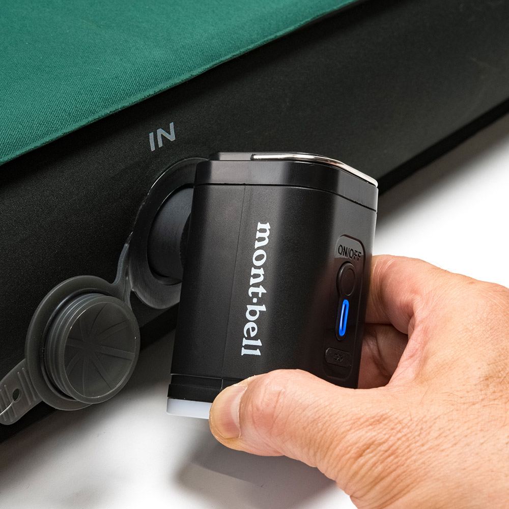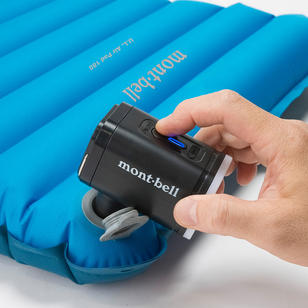 モンベルの空気注入式スリーピングパッドに対応した軽量なUSB充電式の電動ポンプです。ポンプの底面には3段階の光量調整が可能なLEDライトが付いており、ランタンとしても使用できます。ノズルはモンベルのスリーピングパッドに対応した大きいノズルと小さいノズルの2種類と、浮き輪や家庭用プールなどに使える汎用ノズルの計3種類が付属します。