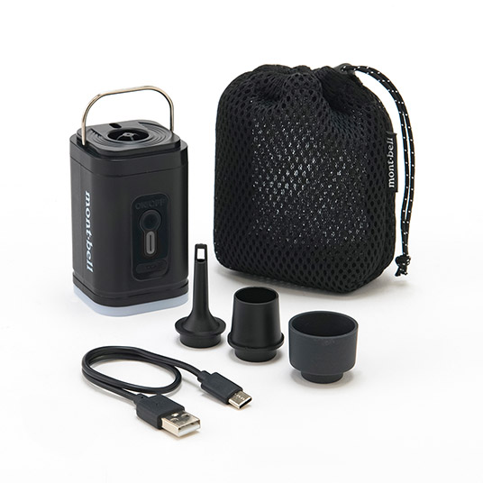 【付属品】モンベル製マット用ノズル2個(大1、小1)、汎用ノズル1個、USBケーブル1本(Type C - Type A)、スタッフバッグ