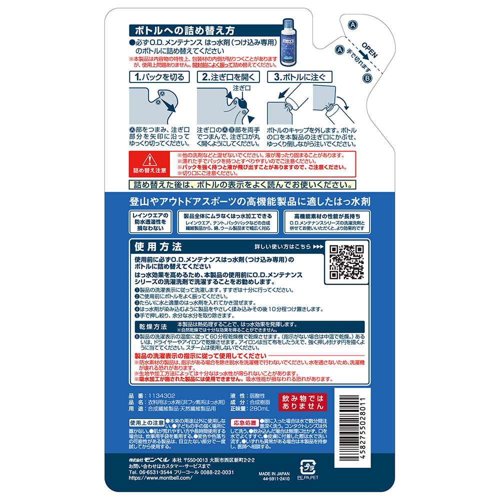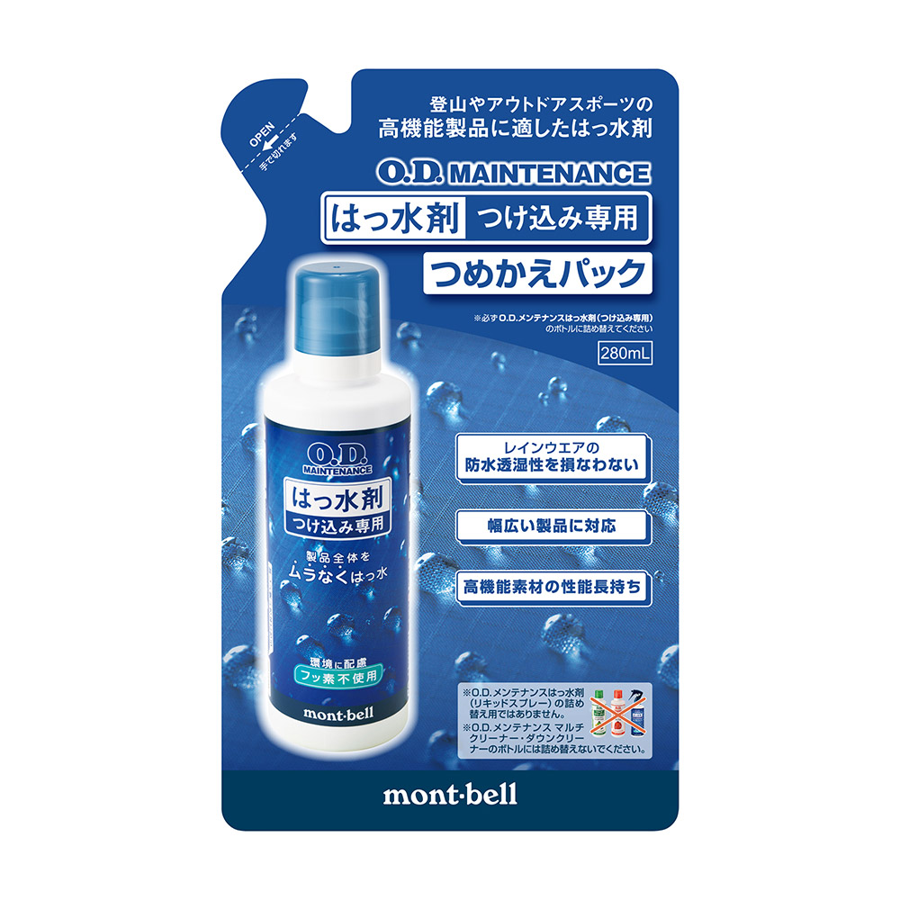 O.D.メンテナンス はっ水剤(#1134134)の詰め替え用パックです。PFAS(有機フッ素化合物)を使用しない環境に配慮したはっ水剤です。乾燥機やドライヤーで熱処理を加えることで、はっ水性能が得られます。レインウエアの防水透湿性を損なわずに加工を施すことができます。「O.D.メンテナンス」シリーズのマルチクリーナーと併せての使用が効果的です。詳しい使い方はこちらをご覧ください。