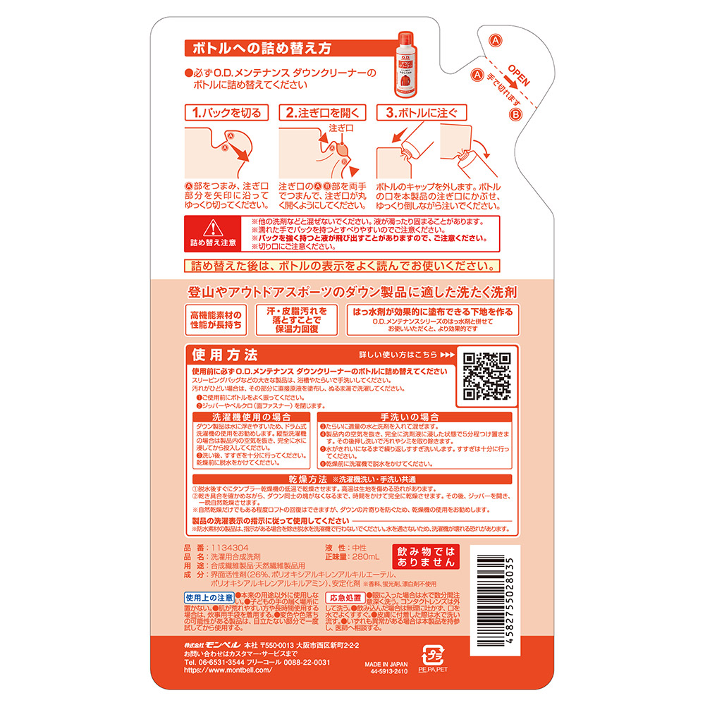 O.D.メンテナンス ダウンクリーナー(#1134136)の詰め替え用パックです。ダウンや化繊綿を使用した保温材入りウエア、ギアの洗濯に適した洗剤です。汚れを落とすことでロフトを復活させ、保温力が回復します。中性なので保温材や繊維を傷めることなく、優れた洗浄成分が汗や皮脂などの汚れをしっかり落し、高機能素材の性能を長持ちさせます。また、はっ水剤が効果的に塗布できる下地を作ります。「O.D.メンテナンス」シリーズのはっ水剤と併せての使用が効果的です。詳しい使い方はこちらをご覧ください。
