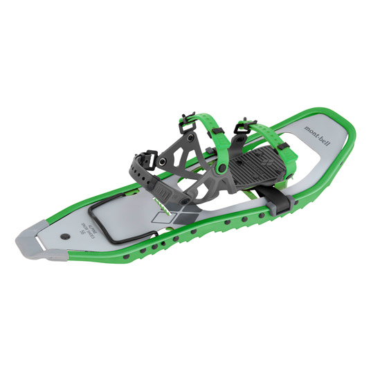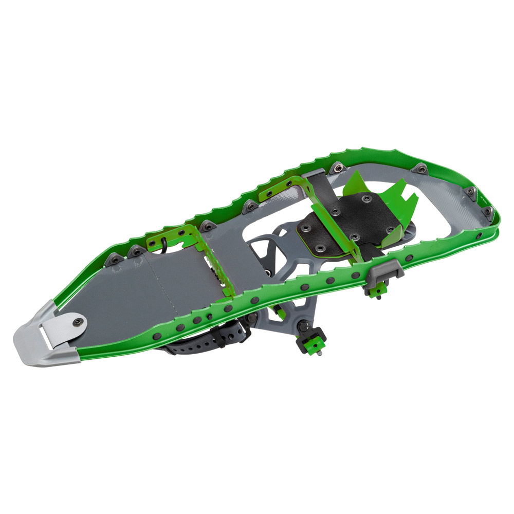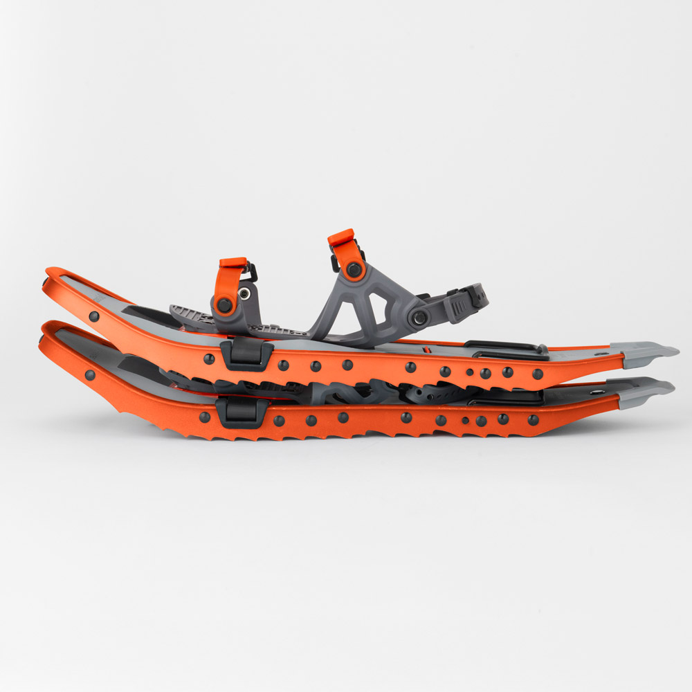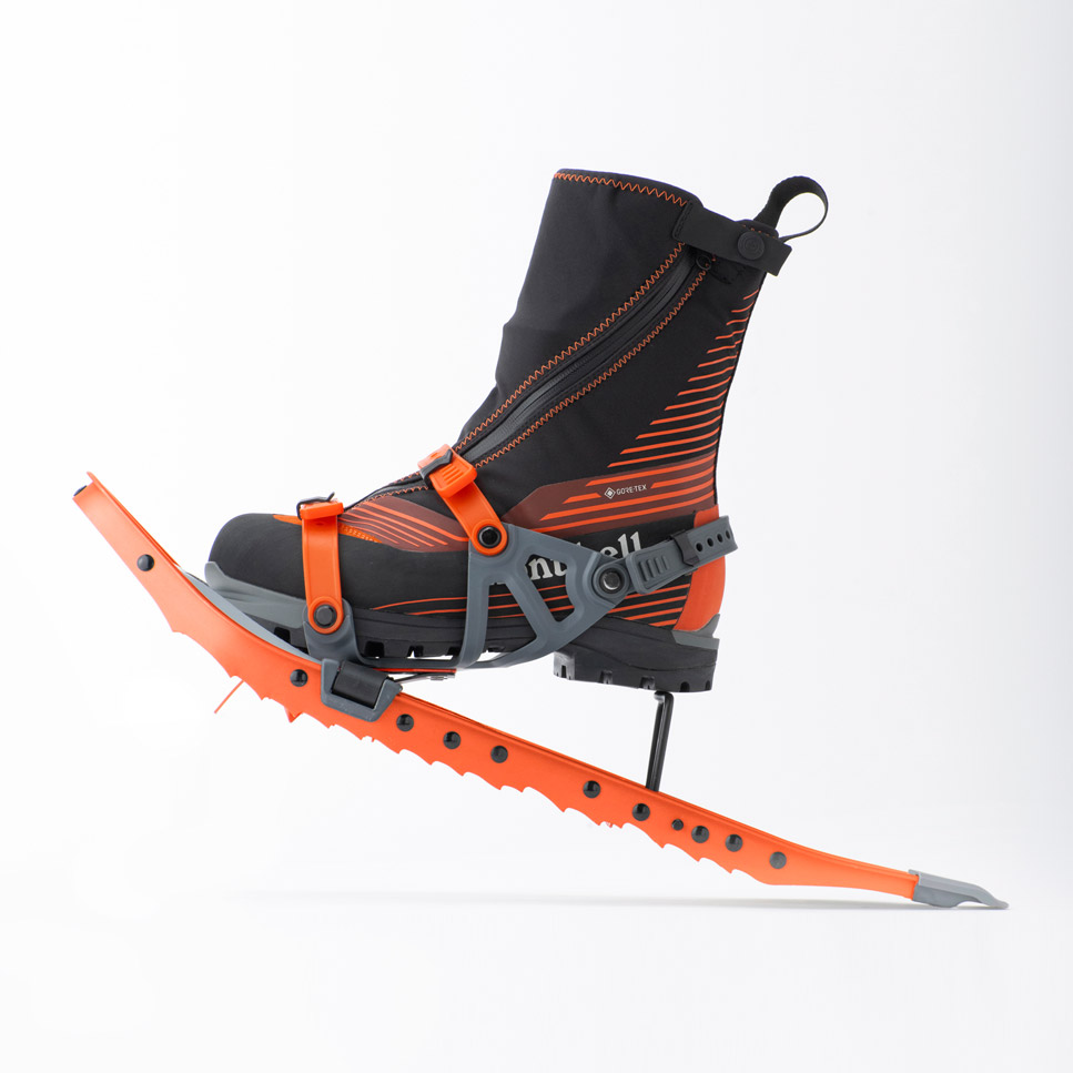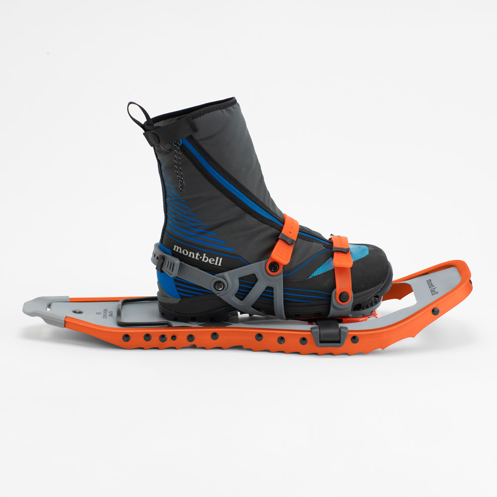 取り回しの良いコンパクトなサイズの山岳用スノーシューです。フレーム全体がクリートとして機能するT型断面フレームがトラバース時に高いグリップ力を発揮します。クランポンの回転軸に反発性のあるフレックスバンドを使用することで、歩行時にデッキが垂れ下がることなく軽快な足運びを実現。急斜面に対応するヒールリフトを搭載し、雪深く傾斜の強い山岳地形でも歩行しやすくなっています。ハーネスには保水しにくいエラストマーバンドを使用することで極寒地での使用にも対応。ハーネスはフラットに収納できるので重ねて携行する時にも嵩張りません。