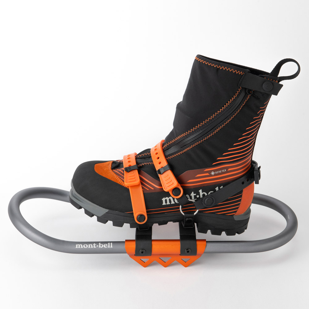 保水しにくいエラストマーバンドを使用した軽量なワカンです。グローブをしたままでも素早い着脱が可能で、フィット感が高く、歩行中にズレにくくなっています。また雪面の状況に応じてアイゼンを装着したまま取り付けることができます。
