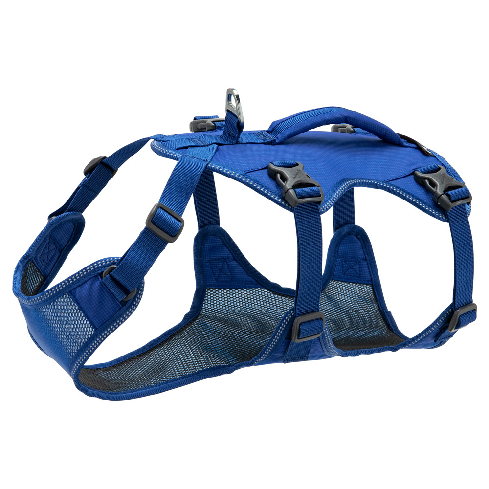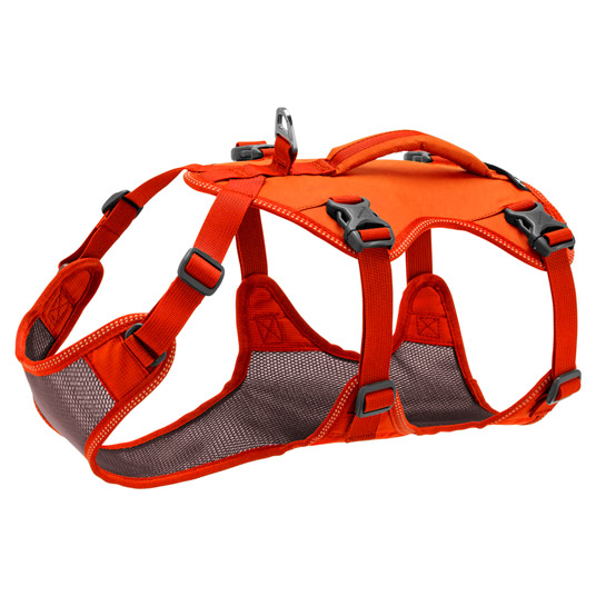 通気性に優れたメッシュ素材を使用したハーネスです。補助ハンドル付きで、岩場など段差のある場所で愛犬を持ち上げてサポートすることができます。体を包み込むようなデザインで、背中側にはEVAフォームを入れ、持ち上げる際にしっかり支え、犬への負担を最小限に抑えています。