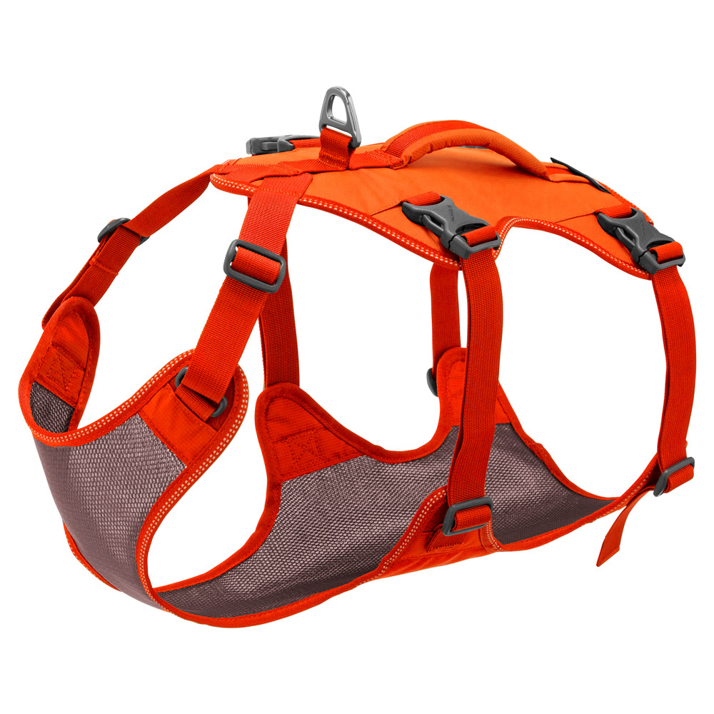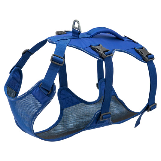 通気性に優れたメッシュ素材を使用したハーネスです。補助ハンドル付きで、岩場など段差のある場所で愛犬を持ち上げてサポートすることができます。体を包み込むようなデザインで、背中側にはEVAフォームを入れ、持ち上げる際にしっかり支え、犬への負担を最小限に抑えています。