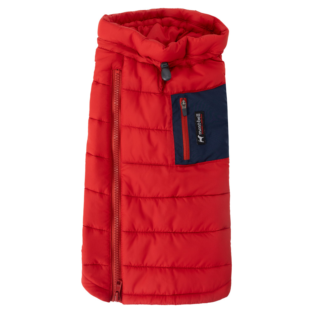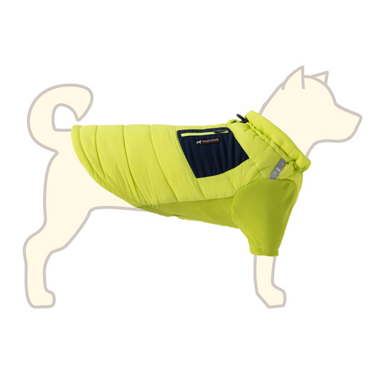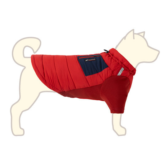 保温性に優れ、お手入れもしやすい化繊綿「エクセロフト®」を使用した犬用ウエアです。肩から脇部分はストレッチ性のあるフリース素材なので、動きやすくフィット感にも優れます。寒い時季のお散歩におすすめです。首回りはドローコードでフィット感を調節でき、背面首元にリードを通せる穴があるため、カラー(首輪)の上から着用できます。ジッパー式で大きく開き、着脱しやすい仕様。反射素材付きで夜間の安全性を高めています。背面にジッパー付きポケットがあります。