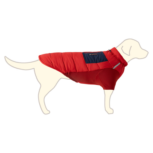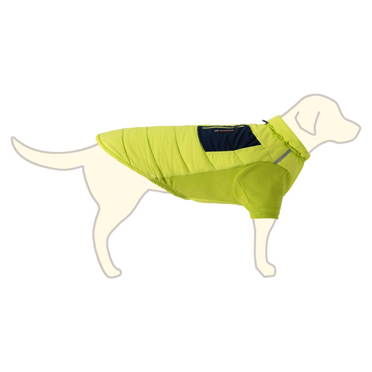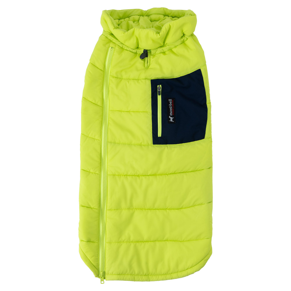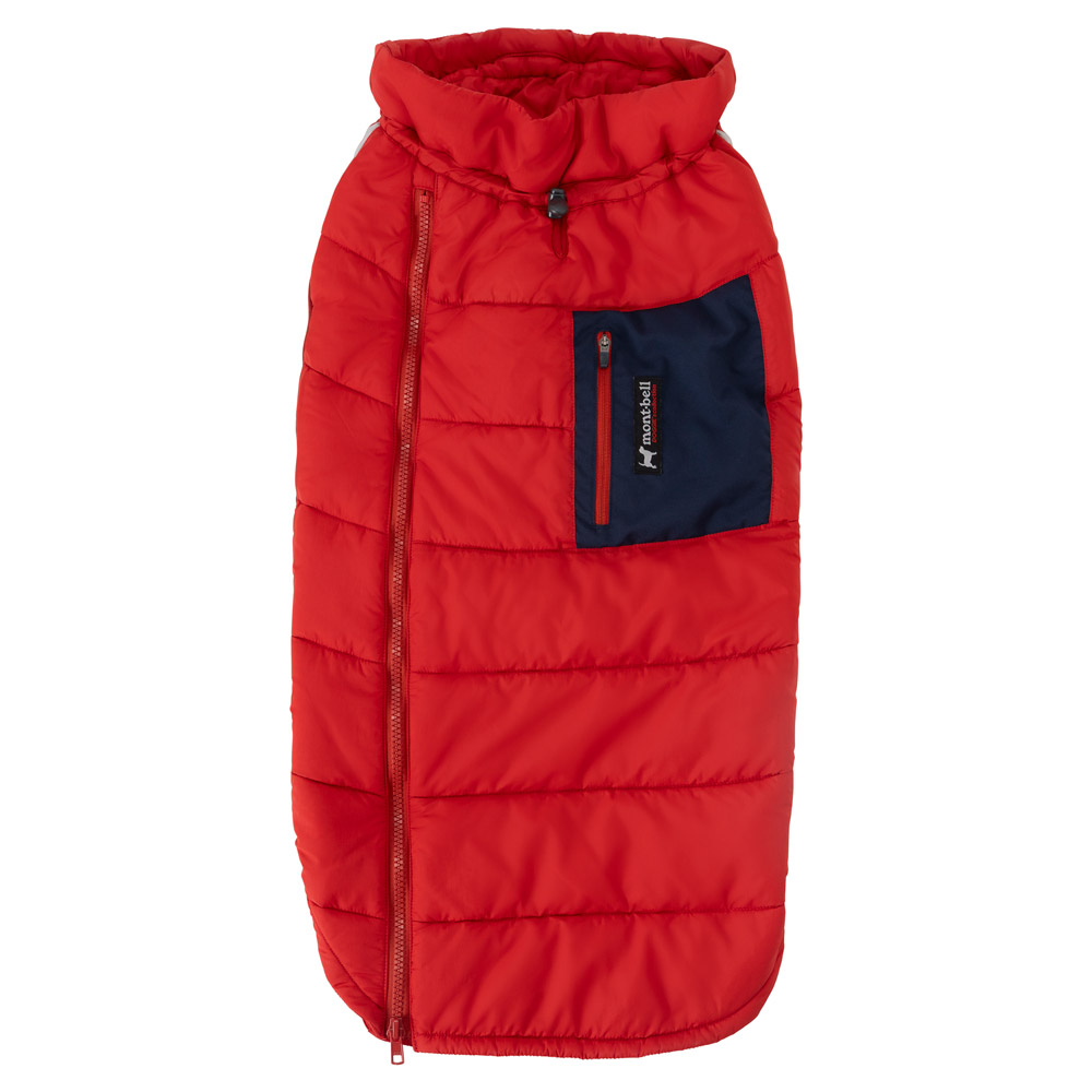 保温性に優れ、お手入れもしやすい化繊綿「エクセロフト®」を使用した犬用ウエアです。肩から脇部分はストレッチ性のあるフリース素材なので、動きやすくフィット感にも優れます。寒い時季のお散歩におすすめです。首回りはドローコードでフィット感を調節でき、背面首元にリードを通せる穴があるため、カラー(首輪)の上から着用できます。ジッパー式で大きく開き、着脱しやすい仕様。反射素材付きで夜間の安全性を高めています。背面にジッパー付きポケットがあります。