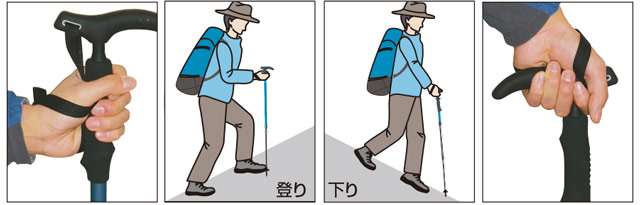 グリップの上から手のひらを載せることで体重をかけやすいタイプです。比較的緩やかなコースを歩く際に適し、初心者でも簡単に扱うことができるという特長があります。平坦地で、身長の2分の1が目安の長さとなります。