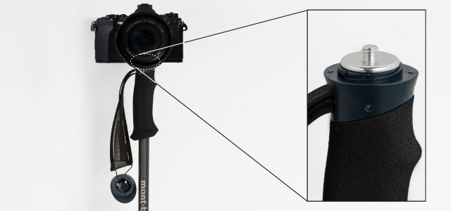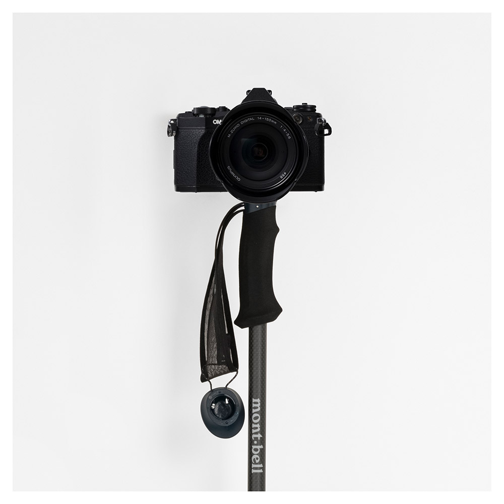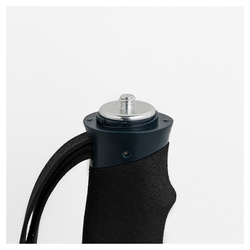 キャップを取り外し、カメラの三脚穴にセットすれば一脚として使用できます。キャップは半回転させることで簡単に脱着可能。紛失を防ぐリーシュが付いています。