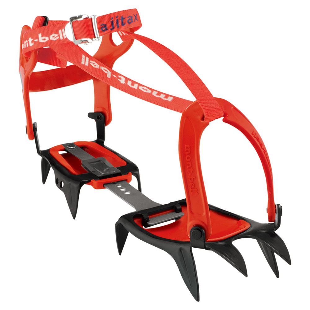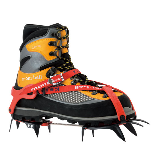 冬季の縦走に最適な、10本爪の軽量なアイゼン。サイズの小さな登山靴にもよくフィットします。樹脂製ハーネスとナイロンテープで固定する方式。コバのない靴にも取り付け可能。