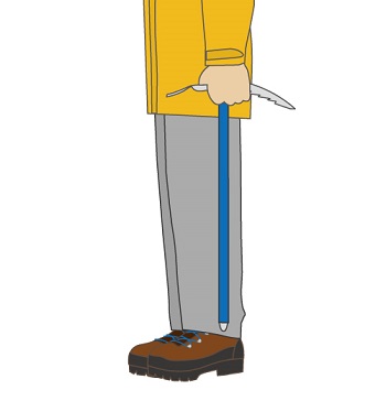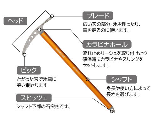 歩行時にバランスを取るために杖として使ったり、急斜面に突き刺して手掛かりにします。また風が強いときに耐風姿勢を取るのにも使用します。