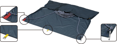 ビレイ時にロープを汚れから守る、取り外し可能なシートが付属。シート端を折り返して使用することができ、傾斜のある場所でのビレイ時にもロープが滑り落ちるのを防ぎます。ロープ端を認識しやすい3色のテープ付き。