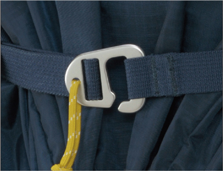 マルチピッチのアイスクライミングやミックスクライミングには、時々、ロープを使う必要のないピッチが現れます。このバッグはバックパックとしてロープを運搬することができるので、そういった場面でも非常に有効です。容量の大きなポケットがついているので、行動食や飲み物を携行することもできます。シンプルなウエストバンドで余計なフレームも無いので軽量で、背負ったまま登ってもストレスがありません。基本的には地面に置いて使う道具なので、踏んでしまうことがある。踏んだ時に壊れないようにバックルはアルミ製という点も心強いです。