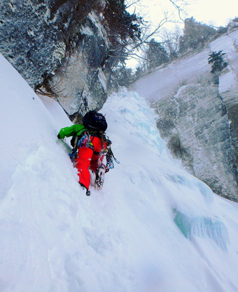 私がロープバッグを一番必要とする場面はアイスクライミングです。できるだけロープを氷や雪に接触させたくはないからです。また、アイゼンでシートを踏んでしまうため、大きなシートの上にロープを広げるのもあまりよくないという悩みもありました。