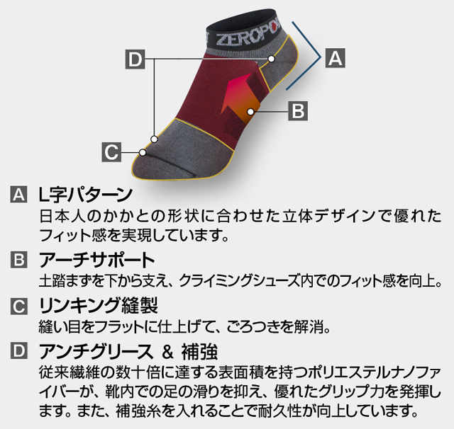 薄手で滑りにくく、足裏感覚に優れたクライミングシューズ用ソックスです。異形断面の糸が汗を素早く吸水拡散する、独自の高機能素材を使用。つま先とかかとにはポリエステルナノファイバーを採用し、靴内での滑りを抑え、素足に近い足裏感覚を実現しています。また、甲部の滑りを良くすることで、シューズの脱ぎ履きが容易に行えます。いやな臭いを抑える優れた消臭性能も備え、快適な履き心地が持続します。