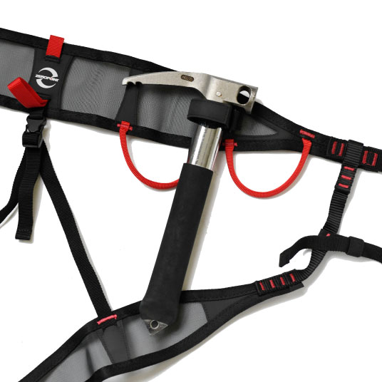 沢登り、アルパインクライミング、スキー登山での使用を目的とした軽量コンパクトなハーネスです。前側2カ所のクイックリリースバックルにより、ブーツを履いた状態でも着脱が容易に行えます。ヒップバックルで、レッグループの位置が調節可能。ギアラック、バックロープけん引用のテープ、ハンマーを収納することができるハンマーホルダーを備えています。