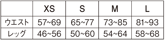 【サイズ】XSサイズ(ウエスト57~69cm、レッグ46~56cm)/ Sサイズ(ウエスト65~77cm、レッグ50~60cm)/ Mサイズ(ウエスト73~85cm、レッグ54~64cm)/ Lサイズ(ウエスト81~93cm、レッグ58~68cm)