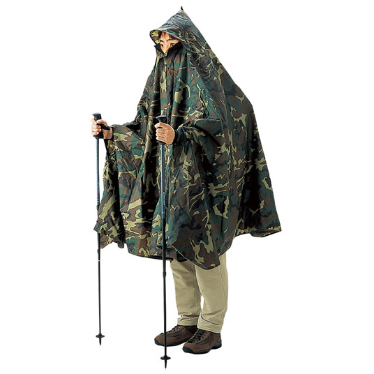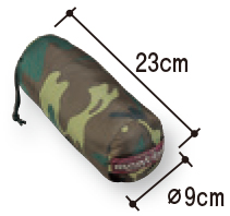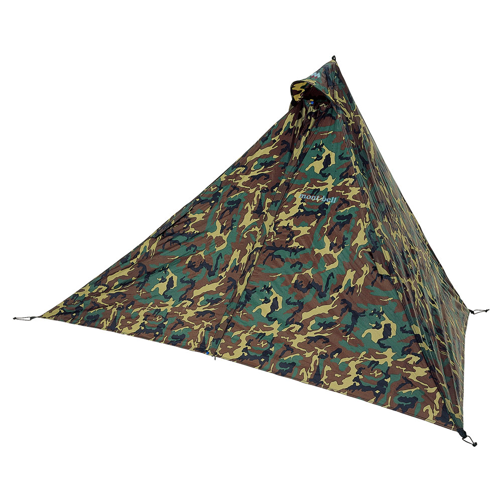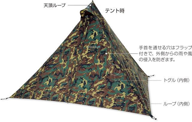 簡易テントとポンチョの機能を併せ持つ軽量コンパクトなアイテムです。簡易テントとして使用する際は、トレッキングポールを支柱にするか、天頂のループを枝などに吊るして設営します。ポンチョとして着用すれば背負ったパックごと雨風を遮ることができます。自然にとけ込むカモフラージュ柄です。スタッフバッグ付き。