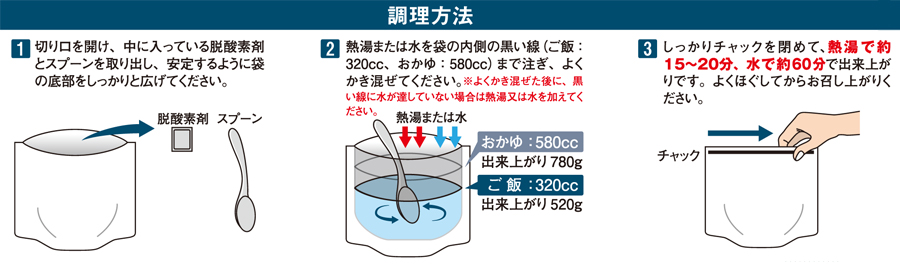 新潟県産のお米を越後山脈の伏流水で炊き上げた後に、急速乾燥(アルファ化)させて長期保存ができるように仕上げたご飯です。お湯を注ぐだけで、簡単に炊きたてのようなふっくらとしたご飯ができあがります。登山やキャンプへの携行はもちろん、非常時のための備蓄・保存用としても活躍します。パッケージは自立するので食器不要で食べられます。スプーン付き。国内製造。