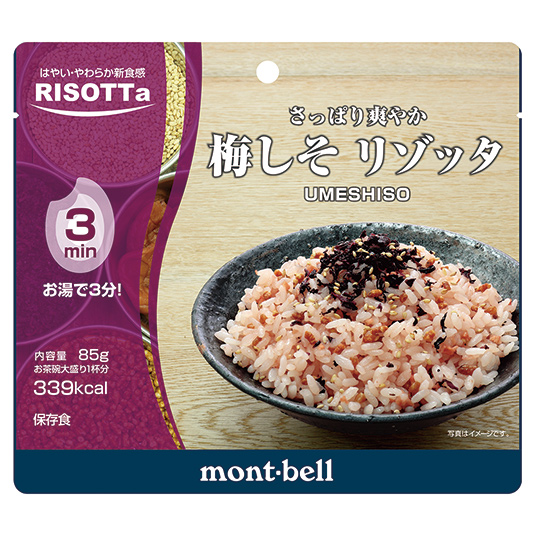 リゾッタシリーズは、モンベルが開発したまったく新しいアウトドア用食品です。従来の常識を覆す短時間調理と、疲れていても食べやすい優しい口当たりを実現しています。極めて軽いので、携行性も抜群。さっぱりとした味わいの梅しそ味です。国内製造。