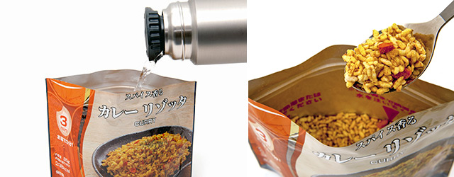 「リゾッタ」はお湯を入れて3分で食べられる、お米を使用したアウトドア用食品。調理時間が短いため冷めにくく、冬の野外でも温かいごはんを食べることができます。そのままの状態でも食べられます。