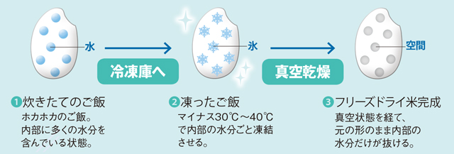 まず食品をマイナス30~40℃の状態におき、食品内部の水分を凍結させます。そのあと真空状態にして減圧。気圧が下がると、固体状態の水分が液体を経ずに気体となる「昇華」という現象が起こります。こうして水分が失われて内側に隙間ができたお米は、熱湯を注ぐと瞬時に水分を吸収して短時間でもどり、すぐに温かいご飯を食べることができるのです。