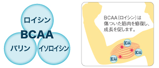 BCAA(= Branched Chain Amino Acids)とは、体内で作り出すことができない9種類の必須アミノ酸のうち、筋肉を構成している割合が特に高い、バリン、ロイシン、イソロイシンという3つのアミノ酸の総称です。