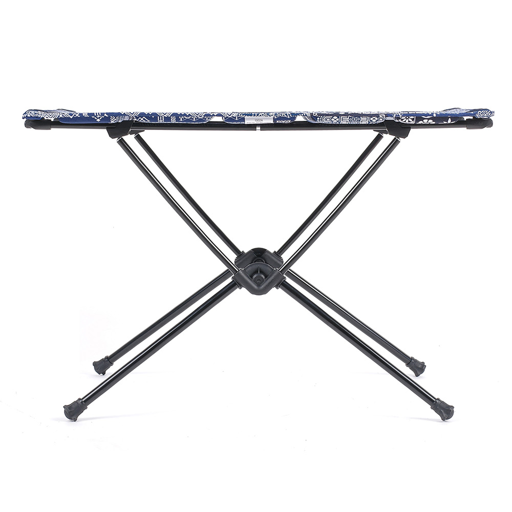 コンパクトになり持ち運びに便利な折り畳みテーブルのバンダナキルト柄のモデルです。天板に樹脂プレートが入っているので、グラスなどを置いても安定感があります。
