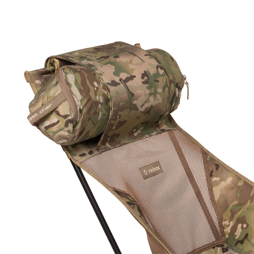 背あて部分が長く、頭部までカバーしてくれるハイバックタイプなので、全身を委ねてリラックスできる「サンセットチェア」のカモフラージュ柄です。右側面に小物を入れるポケット付き。付属のスタッフバッグはヘッドレスト部分に装着して枕として使用できます。スタッフバッグ付き。