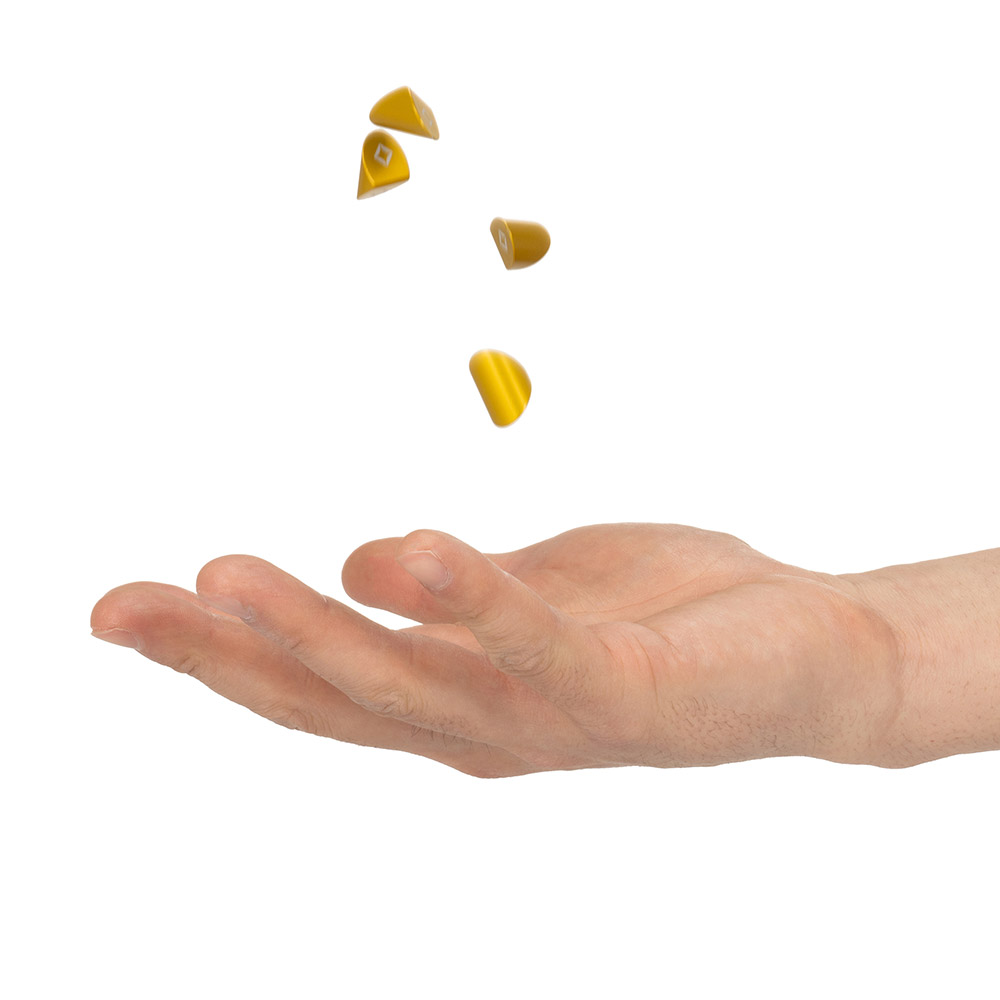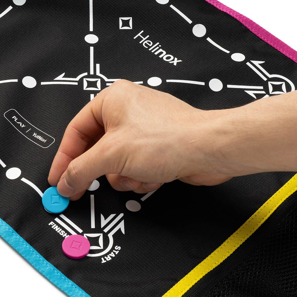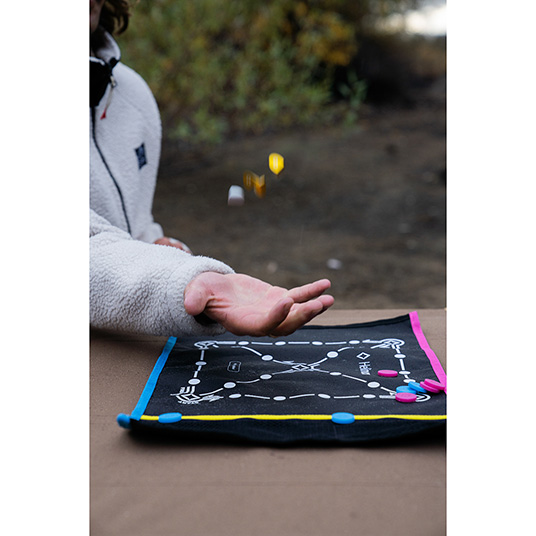 アウトドアフィールドで楽しめる「PLAY」シリーズ。スゴロクのような韓国の伝統的なボードゲームです。サイコロのかわりになるユツ(Yut)を振り、表を向いた数によって進むマスが決まります。2人もしくは2チームで交互にユツを振って駒を進めていき、コーナーや中心のマスに止まってショートカットしたり、相手の駒の上に止まってスタートまで戻させたりと、4つの持ち駒を駆使して進める戦略性のあるゲームです。4つの持ち駒をすべて先にゴールさせると勝利です。