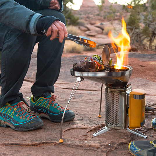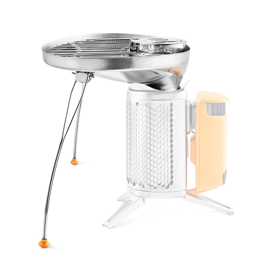 バーベキューが楽しめるキャンプストーブ2 PLUS(別売)専用の折りたたみ式グリルです。すり鉢構造になっているため、肉や魚を焼いたときに出る余分な油も燃焼させることができます。調理中も燃料補給口から、小枝などの補給が簡単に行えます。