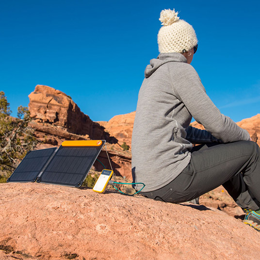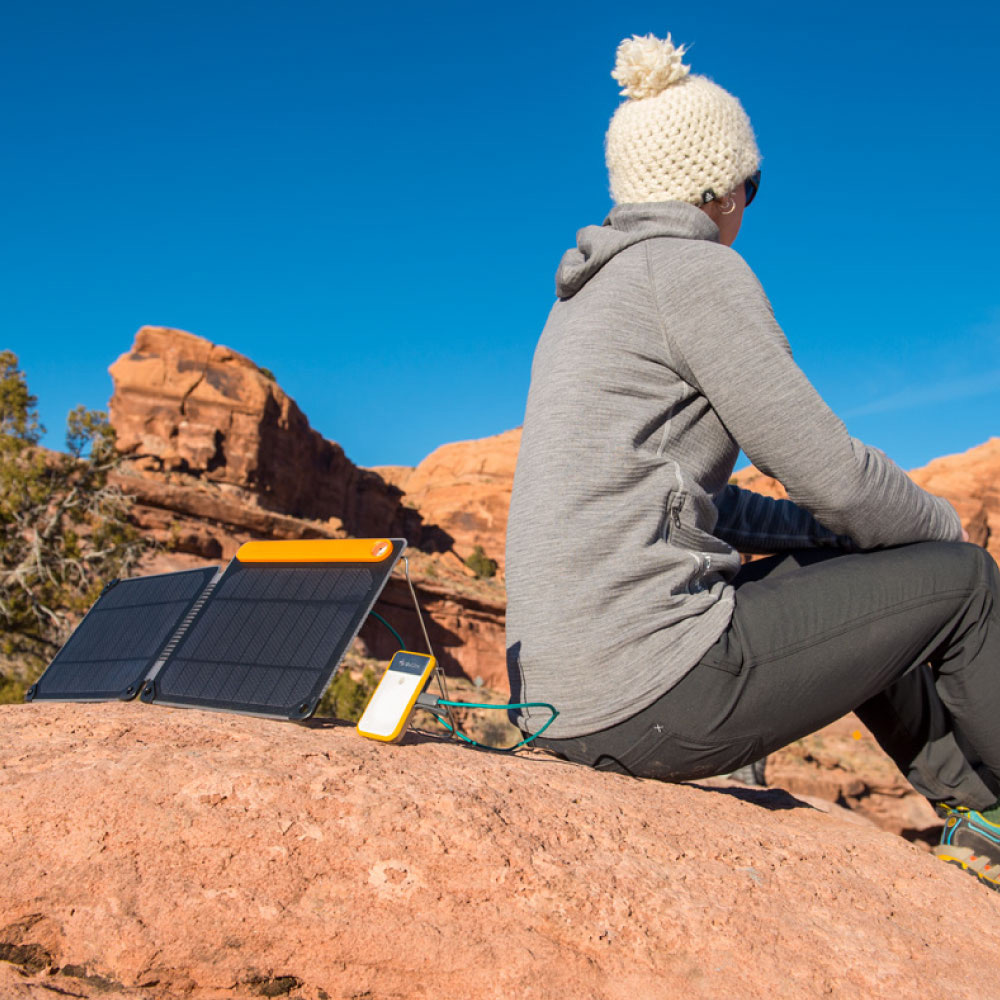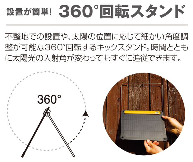 高出力の単結晶ソーラーパネルを採用した薄型ソーラーパネル。折りたたみ式の軽量&スリムなデザインで持ち運びに便利です。発電した電気は内蔵されたリチウムイオン電池に蓄電できるほか、USBポート経由でモバイル機器などを充電することができます。重量やサイズはそのままに、前モデルからバッテリー容量が3200mAhへ増量しています。