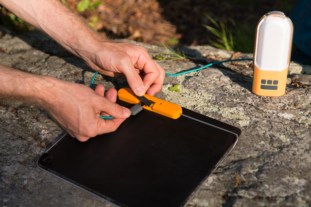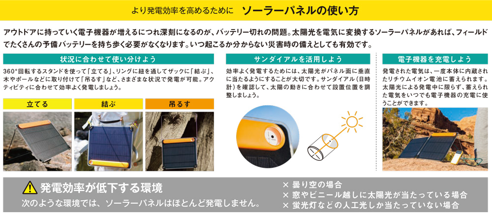 発電した電気はUSBポート経由でモバイル機器などに充電するか、別売りのパワーライトやパワーライトMINIに蓄電することができます。