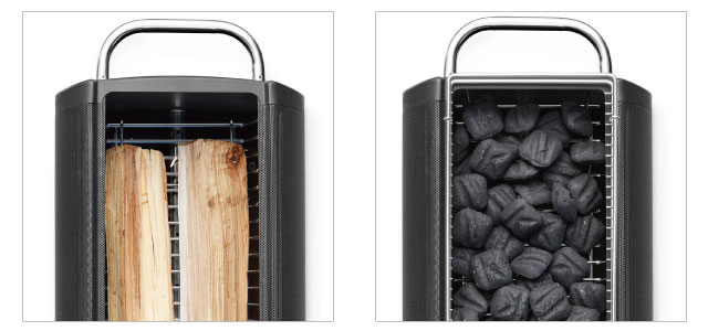 内部のラックは高さ調節が可能。薪・木炭どちらも使用が可能です。