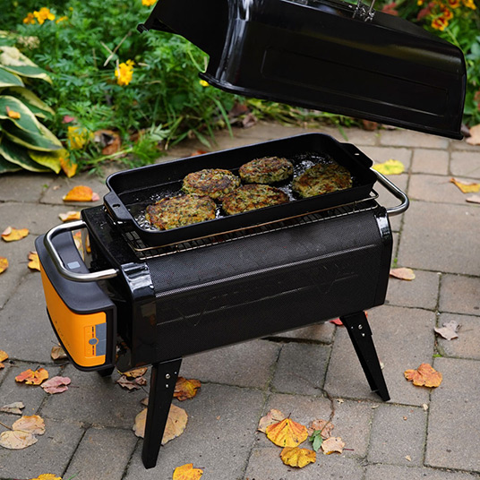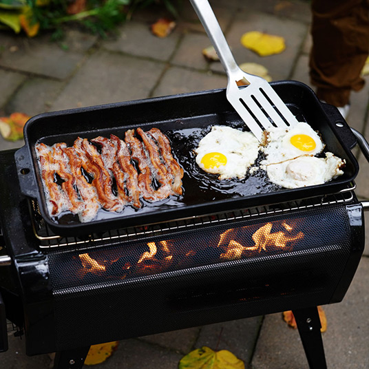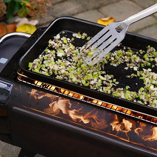 シーズニング加工済みで焦げ付きにくいグリドルです。鋳鉄製の鉄板なので単体で使用ができます。たき火でさまざまな調理が可能になります。別売のファイアピット グリルリッドと組み合わせるとオーブン料理ができ、調理の幅がさらに広がります。