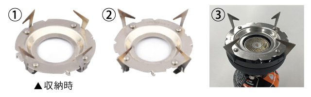 使用の際は収納された状態(1)からゴトクの足を広げ(2)、バーナー本体に装着してください(3)。