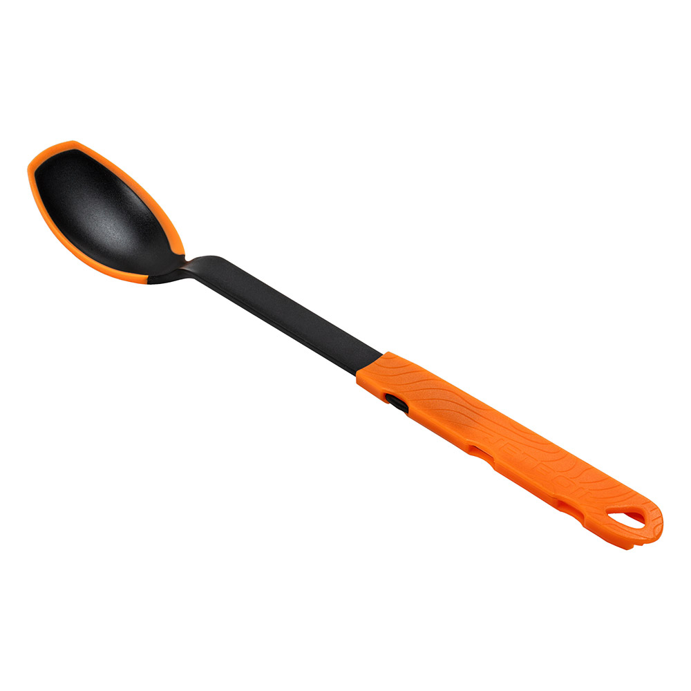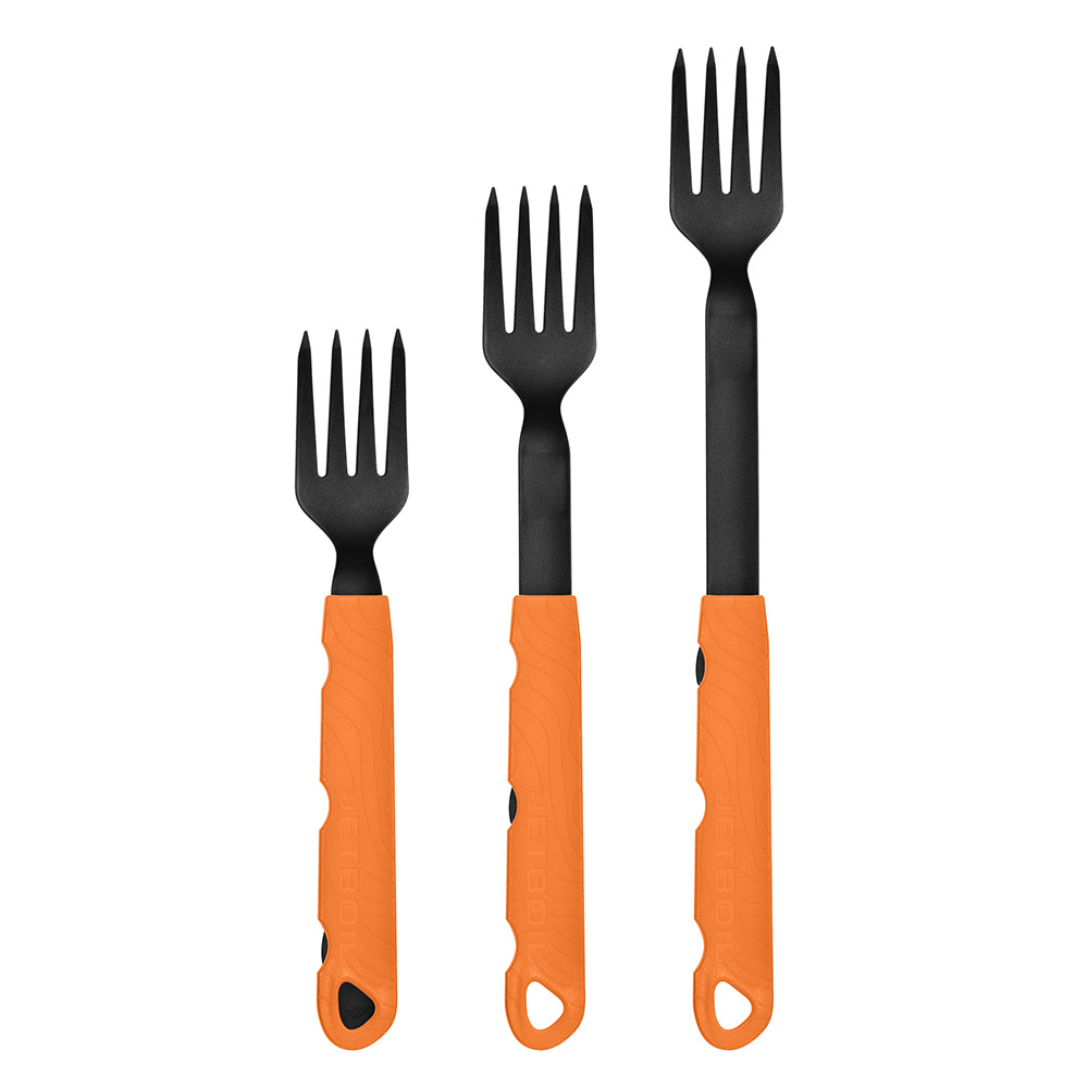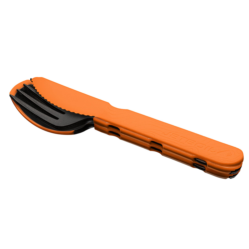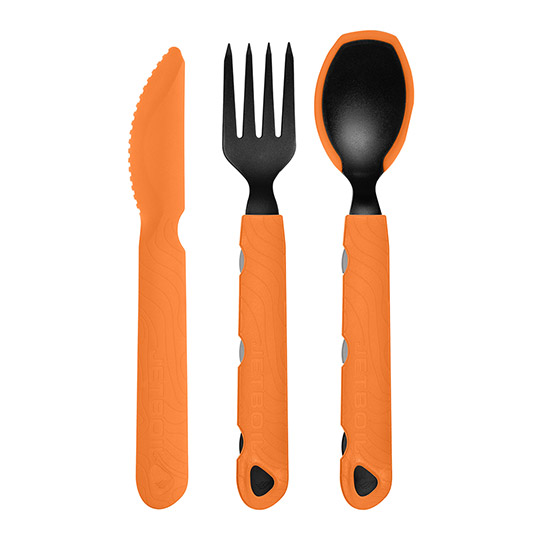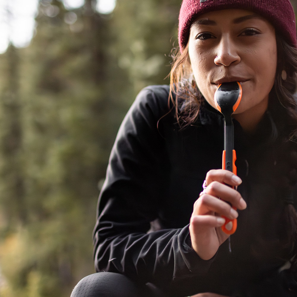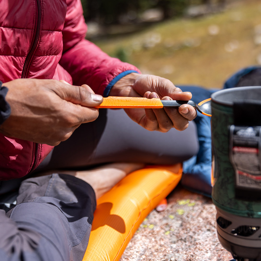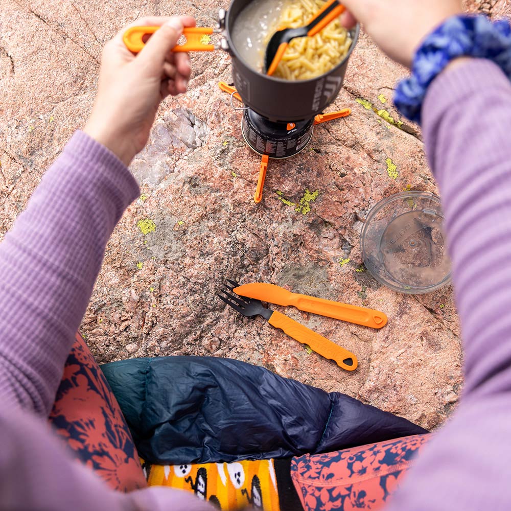 重ねてコンパクトに収納が可能な、スプーン、フォーク、ナイフのセットです。フォークとスプーンは3段階の長さ調節が可能で、深さのあるクッカーやフリーズドライの食品をパッケージからでも食べやすく、調理時のやけどの心配も軽減されます。また、スプーンはシリコンのエッジをそなえ、クッカーを傷つけることなくきれいにすくえます。