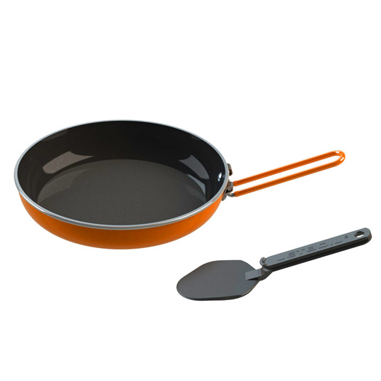 焦げ付きにくいセラミックコーティング(PFOAフリー)が施され、耐久性と耐熱性を備えたスキレット。底面を厚くすることで熱が均一に伝わりやすく、熱が偏りやすいシングルバーナーでも調理がしやすくなっています。ハンドルは折りたたむことが可能で、付属のターナー(フライ返し)をハンドルにはめこんでコンパクトに収納できます。