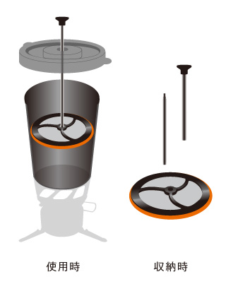 JETBOIL®クッカーをフレンチプレス式コーヒーメーカーとして使用できるオプションアイテム。湯切りざる・蒸し器・落としぶた・泡立て器としても使えます。シリコンリングによりバスケットとクッカーが密着し、スムーズに安定してプレスできます。持ち運ぶ際は分解してクッカー内に収納できます。