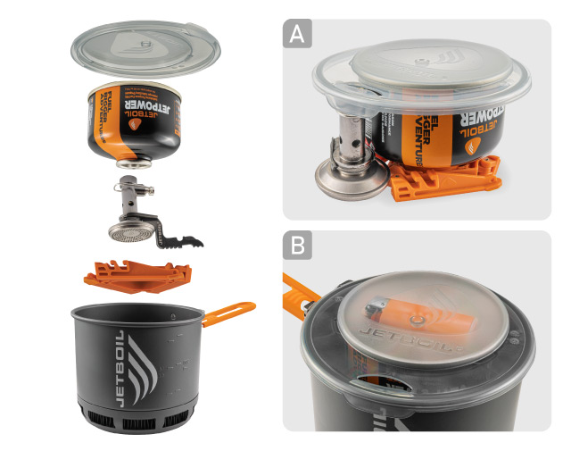 収納時、パーツ同士の隙間が少なく移動時のガタつきも抑えられた理想的なスタッキング(A)が可能。ジェットボイルの特長である、全てのパーツをクッカー本体内に収納して持ち運びができる「オール・イン・ワン設計」です。