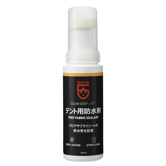 テントのフロアやフライシートなど、合成繊維の生地に防水加工を施せる水性の防水剤です。透明な仕上がりで、補修箇所がほとんど目立ちません。1本で約7.8m²の面積に防水加工を施せます。容器はテントの床に直接塗ることができる便利な形状です。