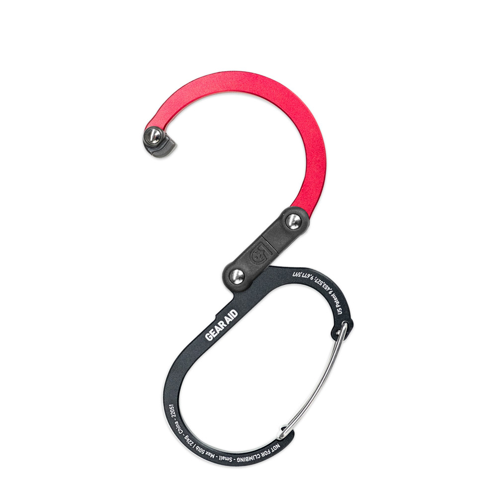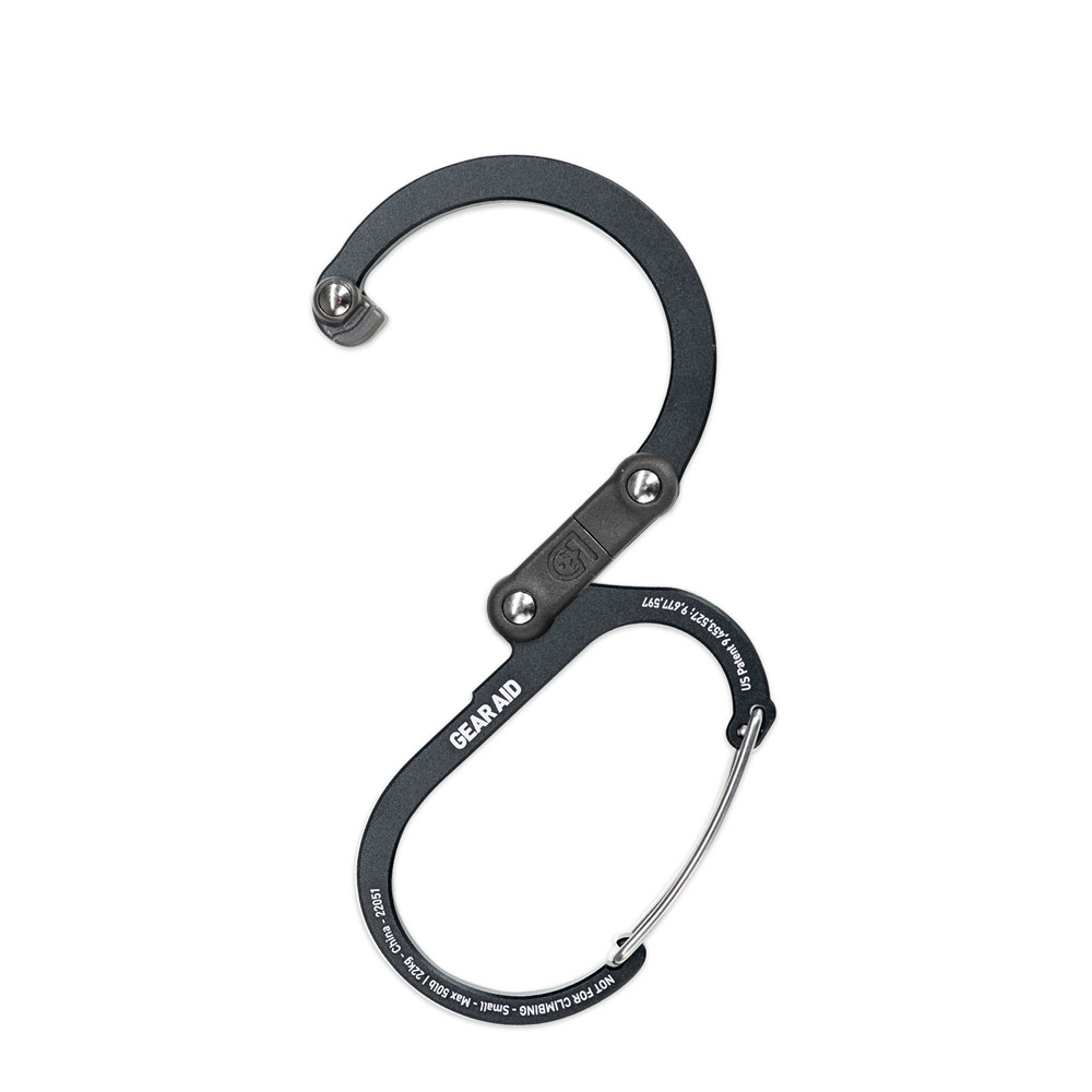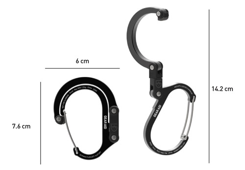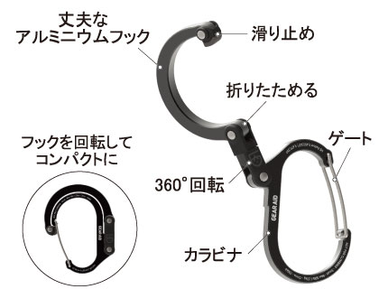 フックを開けばジョイント部が360度回転し、S字フックや回転フックに早変わり。材質は航空機にも使われる等質のアルミニウム合金製で、優れた耐久性を持ちます。フックの先端にはグリップ性の高い素材を使用し、荷物を掛けやすい仕様です。持ち運びに便利なスモールサイズ。