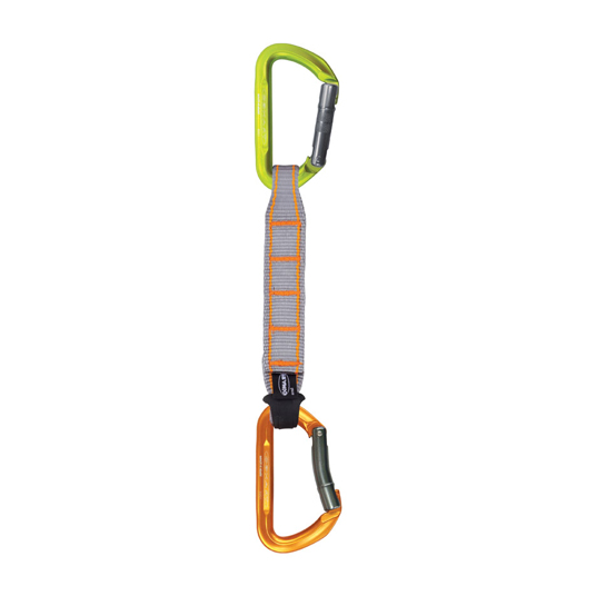 ネオクラシックカラビナと25mm幅テーパードスリングを組み合わせ、高い破断強度を誇る信頼性の高いスポーツドロー。ロープクリップ側はタフバンドでカラビナ固定。