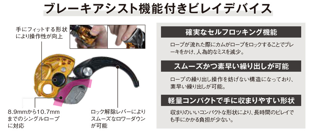 8.9mmから10.7mmまでのシングルロープ専用のセルフロッキングデバイス。