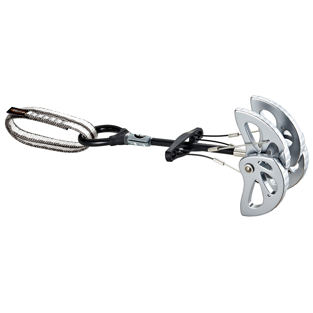 1軸構造により、セット後にカムがずれにくく安定性が高いカムプロテクション。ダイニーマ®製のスリングは2重になっており、延長可能。