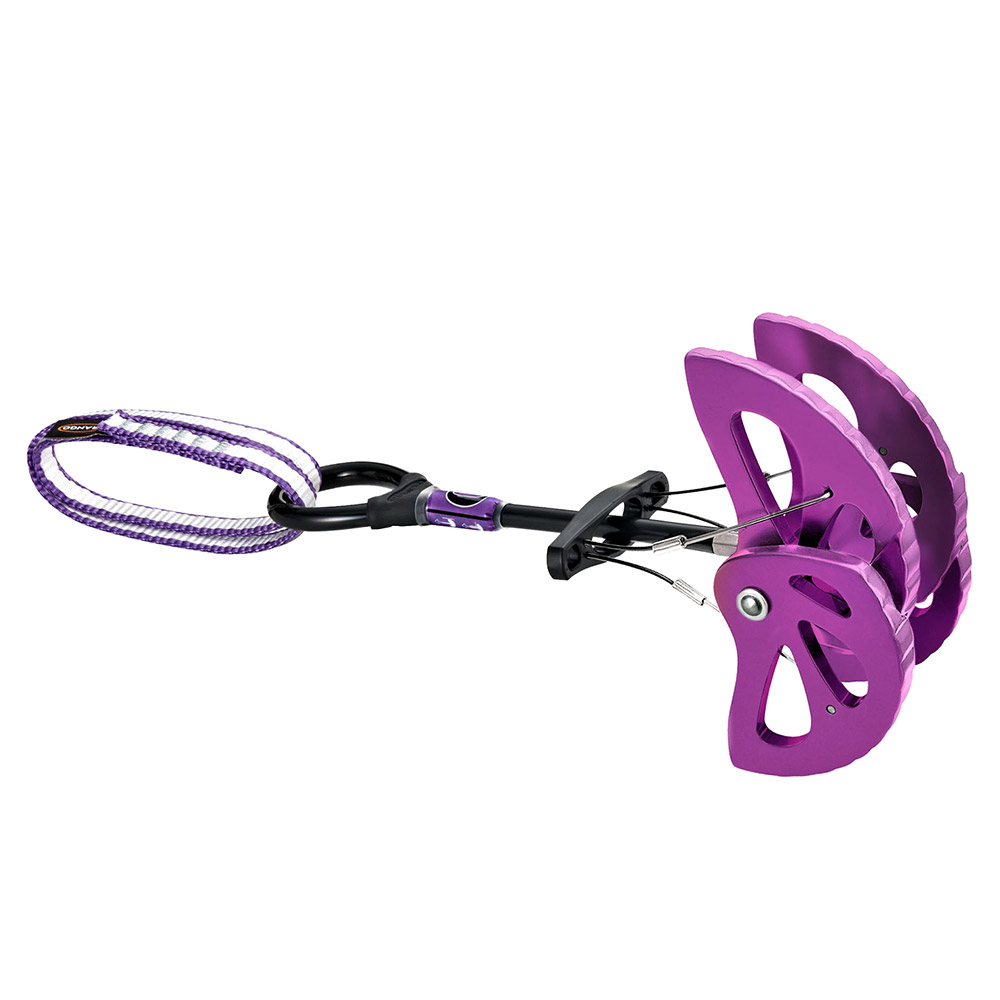 1軸構造により、セット後にカムがずれにくく安定性が高いカムプロテクション。ダイニーマ®製のスリングは2重になっており、延長可能。