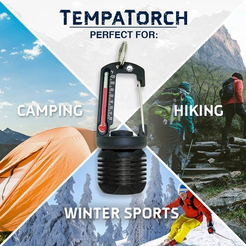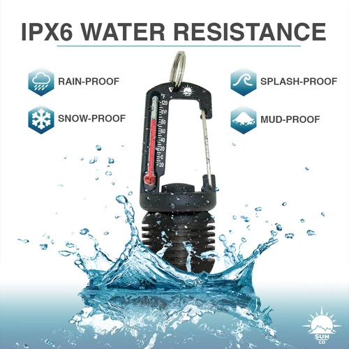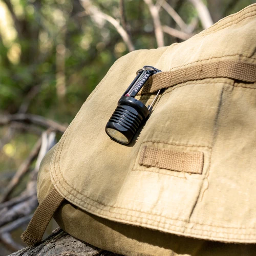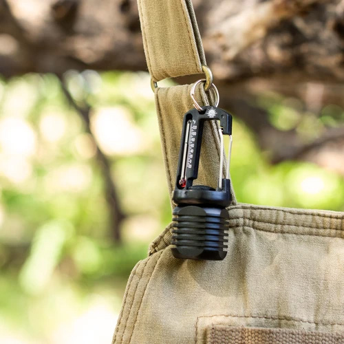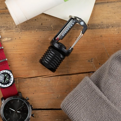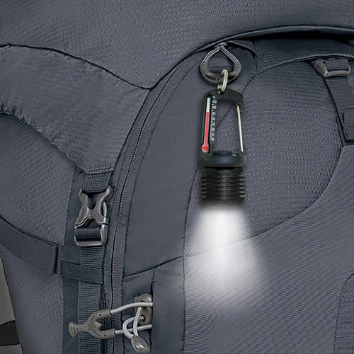 40ルーメンのLEDライトと温度計が付いたカラビナ型のアクセサリーです。ライトは常時点灯と点滅モードに切り替えられます。