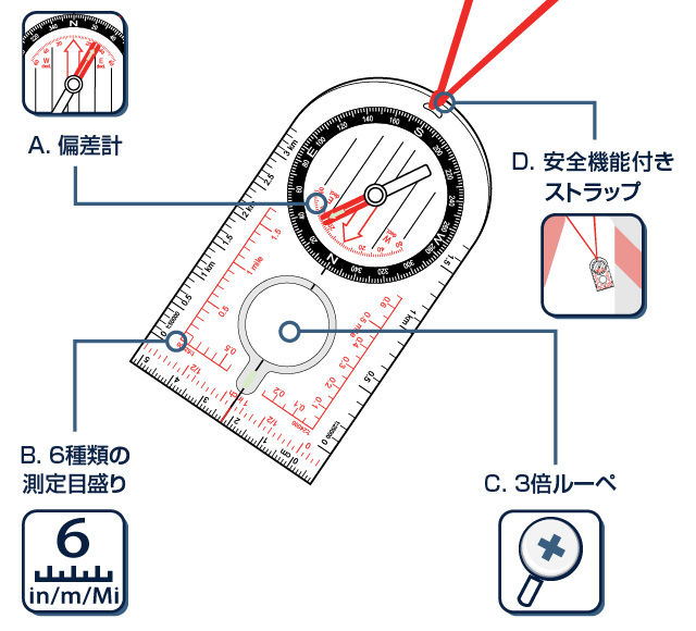 読図用の軽量・コンパクトなベースプレートコンパス。さまざまな地図に対応する6種類の目盛り付きです。
