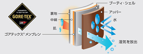 世界最高レベルの防水透湿性素材に保温材を一体化させたライニング構造です。メンブレンと中綿の間にすき間を作らないため、ごわつきが生じず、抜群のフィット感と安定した保温性を実現します。