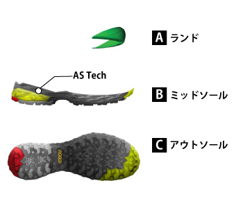 EVAミッドソールはクッション性が高く、着地の衝撃をやわらげます。ヒール部分はかかとを包み込むような形状でサポートし、ミッドソール側面に設けたサポートパーツ(AS Tech)が着地時のぐらつきを防止します。